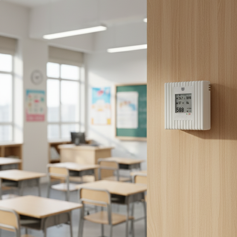 binnenluchtkwaliteit, CO2-monitor, temperatuursensor, vochtigheidssensor, omgevingsmonitor, luchtkwaliteitsensor, professionele sensor, slim huis, kantoorapparatuur, wellness-technologie